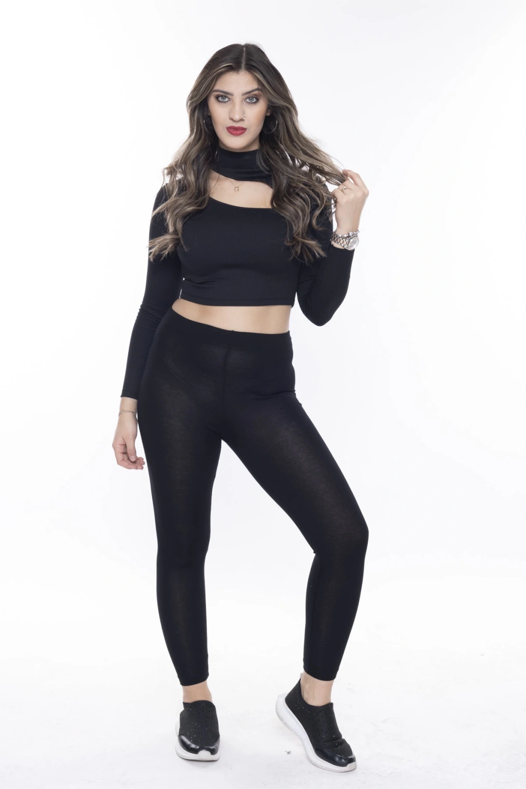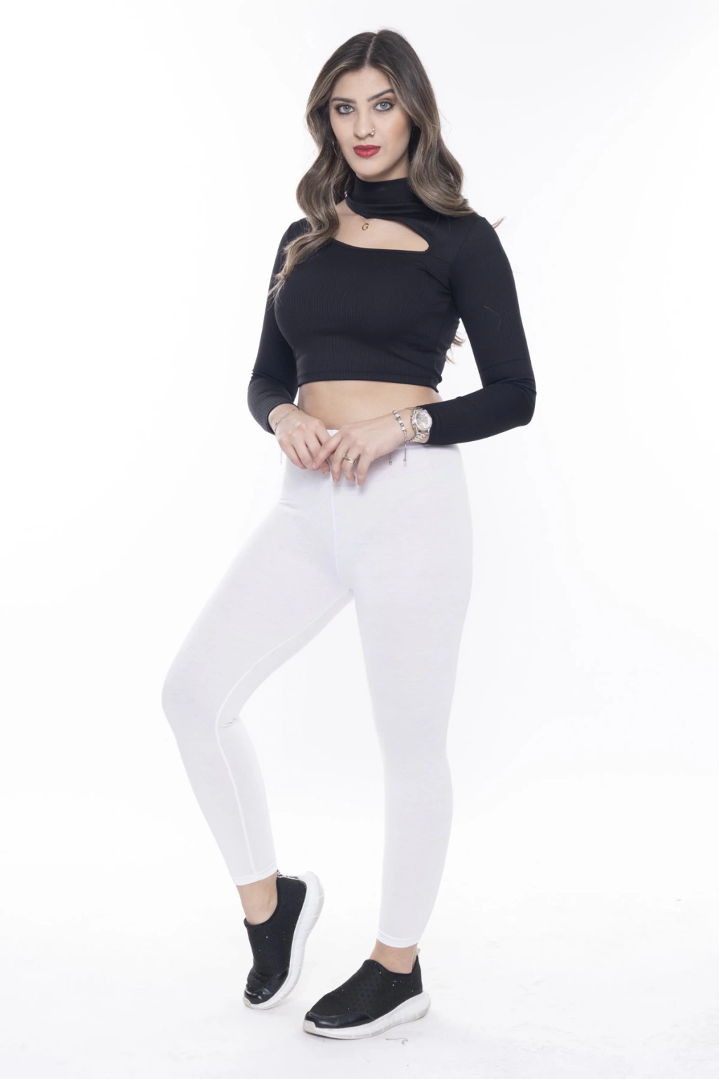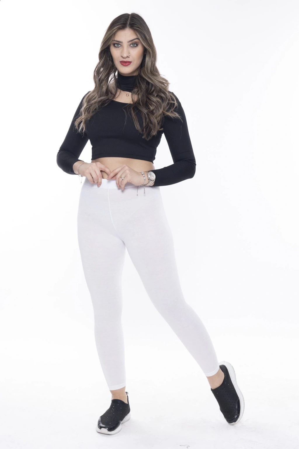Kadın Siyah Beli Lastikli Önü Beyaz W Taş İşlemeli Toparlayıcı Tayt