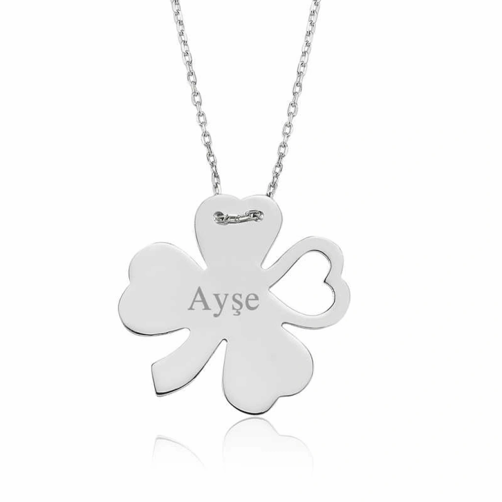 Dört yapraklı yonca bütün kültürlerde iyi şansın sembolü olarak kabul edilir. Yoncanın dört yaprağının da ayrı birer anlamı vardır. Birinci yaprak ümidi, ikincisi imanı, üçüncüsü aşkı, dördüncü yaprak ise şansı simgeler. Bu kolyeye sevdiğiniz kişinin ismini yazdırabilir, şansınızı her daim yanınızda taşıyabilir ya da sevdiklerinize şans hediye edebilirsiniz. Kişiye özel isim yazılabilen dört yapraklı yoncadan oluşan özel tasarım bayan kolye modeli 925 ayar gümüşten imal edilmiştir. Gümüş bayan isimli yonca kolye modeli ile isimleriniz sevdiğiniz kadının teninde hayat bulsun. 45 cm uzunluğunda gümüş zincire sahip bu özel kolye modeli genç aşıkların özel günlerde tercih edebileceği çok şık bir seçenek olacaktır. Bu özel kolye ile sevdiğinizin boynunu aşkla süsleyin. Gümüş bayan isimli yonca kolye modeli üzerinde rodyum kaplama vardır. Rodyum kaplama yapılan gümüş bayan kolye modelleri parlaklığını uzun süre muhafaza eder. Bu özel tasarım isimli kolye sizin olduğu kadar sevdiklerinizin de keyifle takacağı en güzel hediyelerden biri olacaktır. Tüm gümüş bayan kolye modellerimizde olduğu gibi gümüş bayan isimli yonca kolye de el emeği ile üretilmiştir. Gümüş ve değerli taşlar nedeniyle belirtilen ürün ağırlığında ± %10 sapma olabilmektedir.