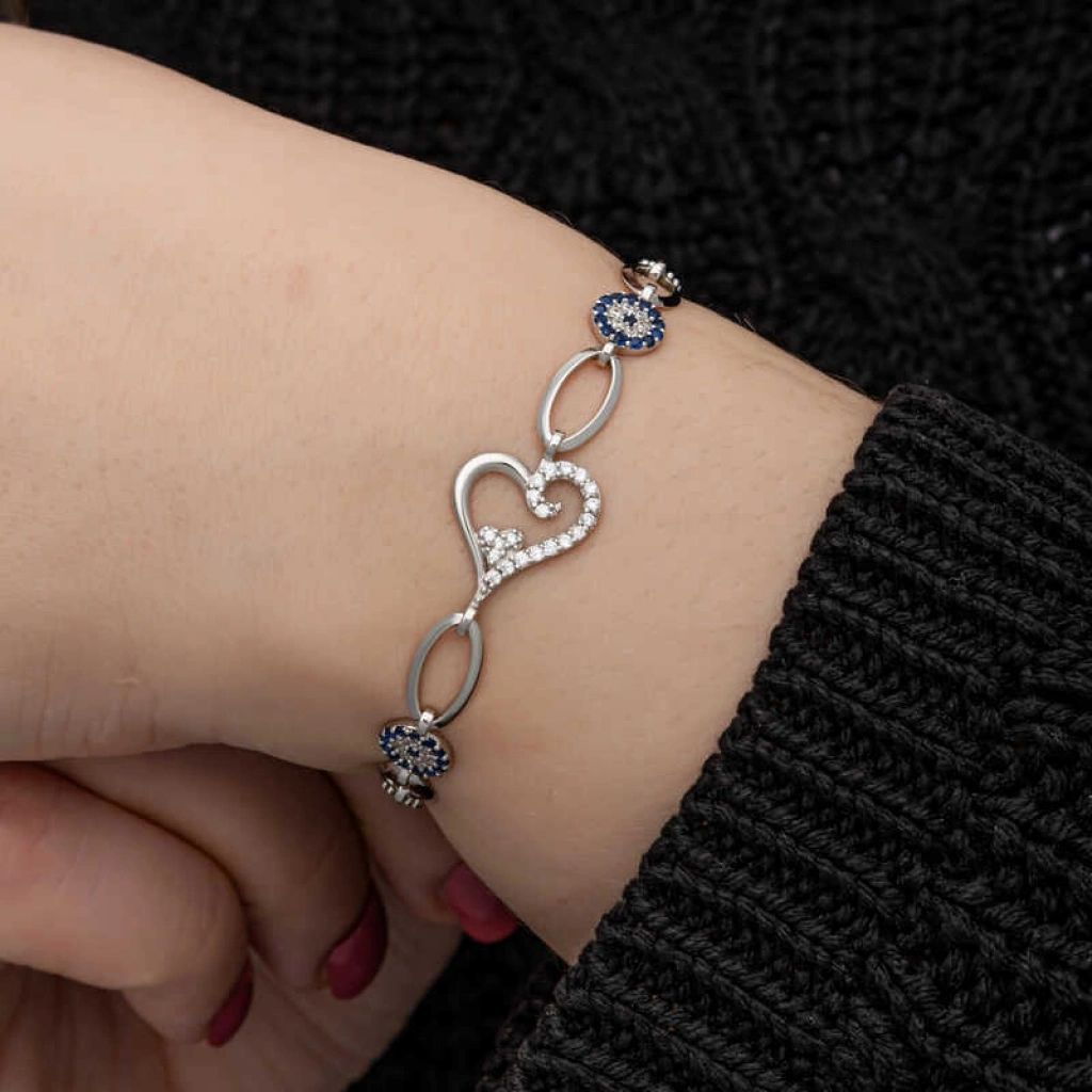 Aşkı bütün saflığı, doğallığı ve içtenliğiyle anlatmanın yoludur kalp... Sonsuz aşkı anlatmak için oluşturulan bu özel tasarımı sevgilinize doğum günü, sevgililer günü yada özel günlerde hediye ederek onları mutlu edebilirsiniz... Bu aşk dolu bileklik 925 ayar gümüşten üretilmiştir. Gümüş kalpli nazar kadın bileklik üzerinde bulunan taşlar zirkondur. Bu kadın gümüş bileklik üzerine rodyum kaplama yapılmıştır. Rodyum kaplama yapılan bileklikler parlaklığını uzun süre muhafaza eder ve oksitlenmesi gecikir. Tüm gümüş bileklik modellerinde olduğu gibi bu gümüş kalpli nazar kadın bileklik modeli de tamamen el emeği ile üretilmiştir. Gümüş ve değerli taşlar nedeniyle belirtilen ortalama ürün ağırlığında ± %10 sapma olabilmektedir.