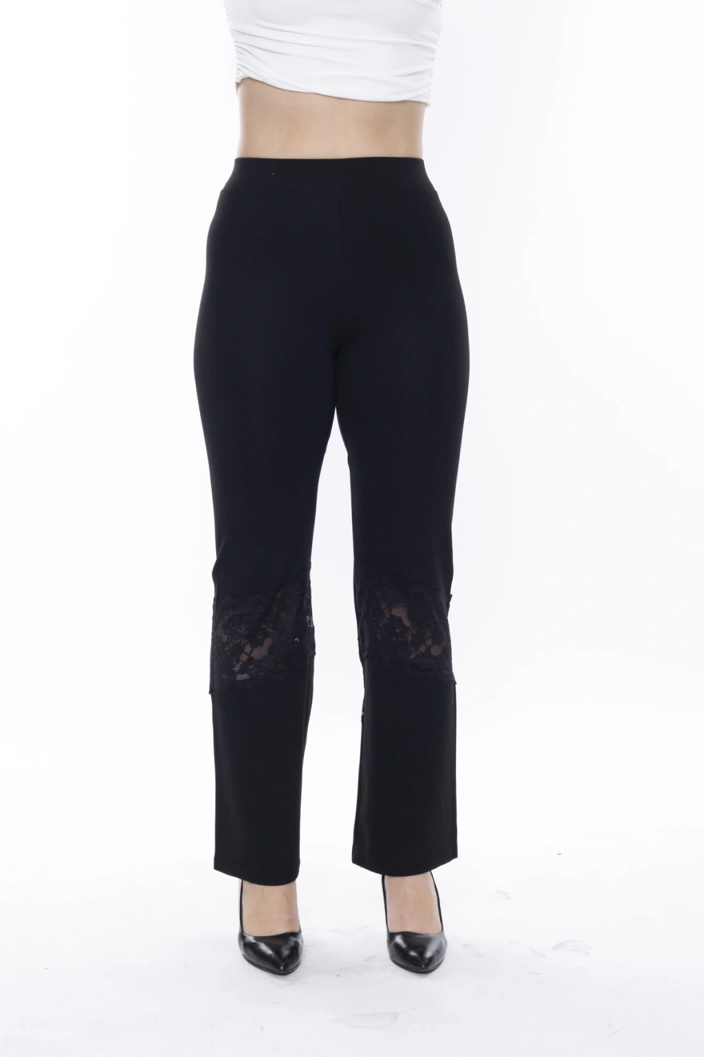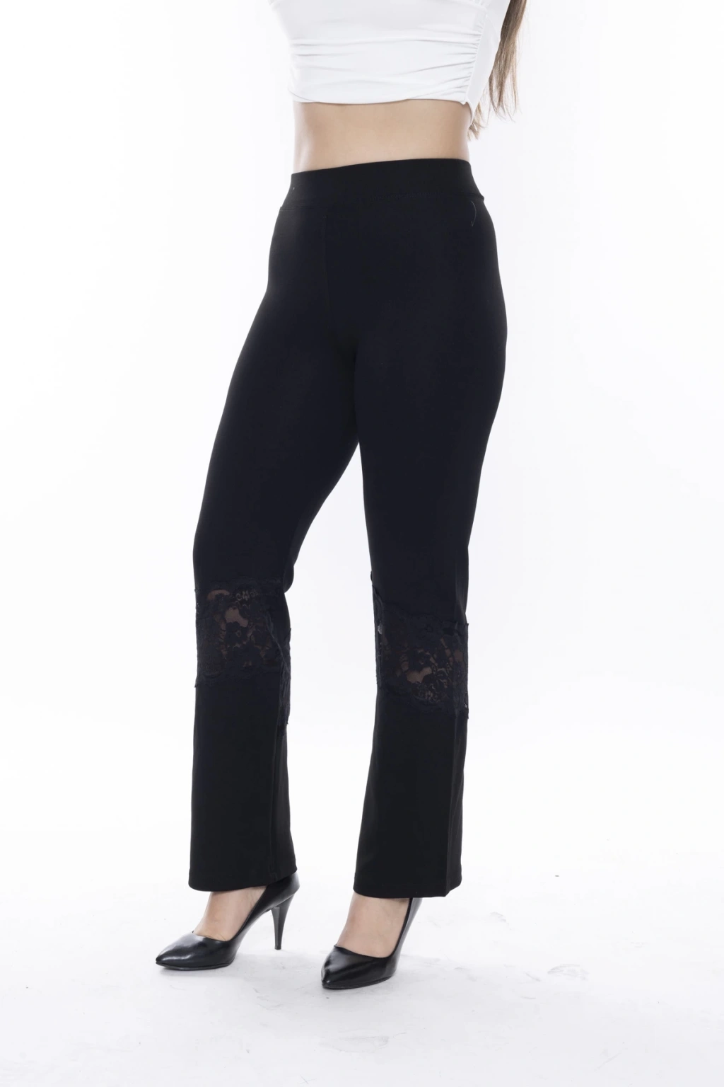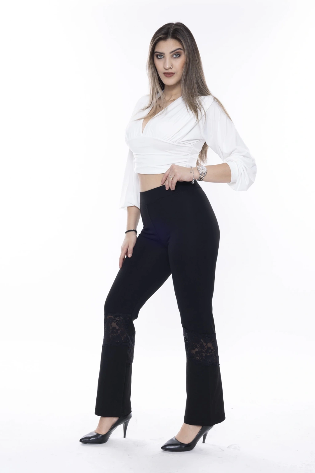 Kadın Siyah Beli Lastikli Dizi Dantelli Toparlayıcı İspanyol Paça Tayt