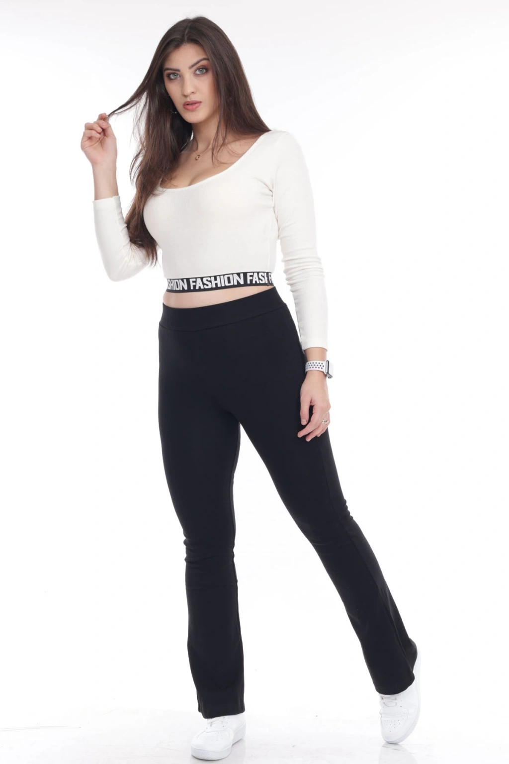 Kadın Siyah Beli Lastikli Önü Beyaz W Taş İşlemeli Toparlayıcı Tayt