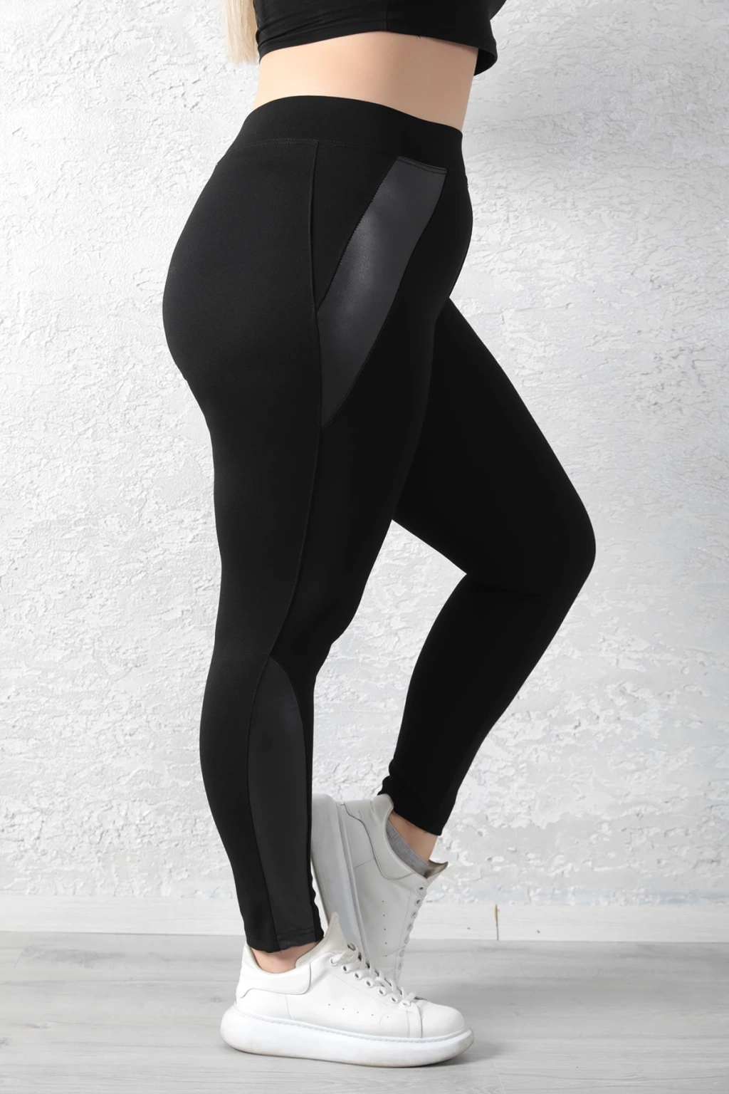 Kadın Siyah Beli Lastikli Yanı Paçası Deri Detaylı Toparlayıcı Büyük Beden Tayt