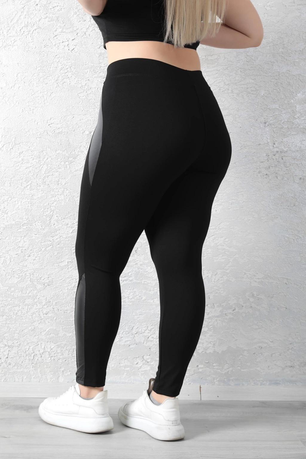 Kadın Siyah Beli Lastikli Deri Sahte Cep Detaylı Toparlayıcı Büyük Beden Tayt