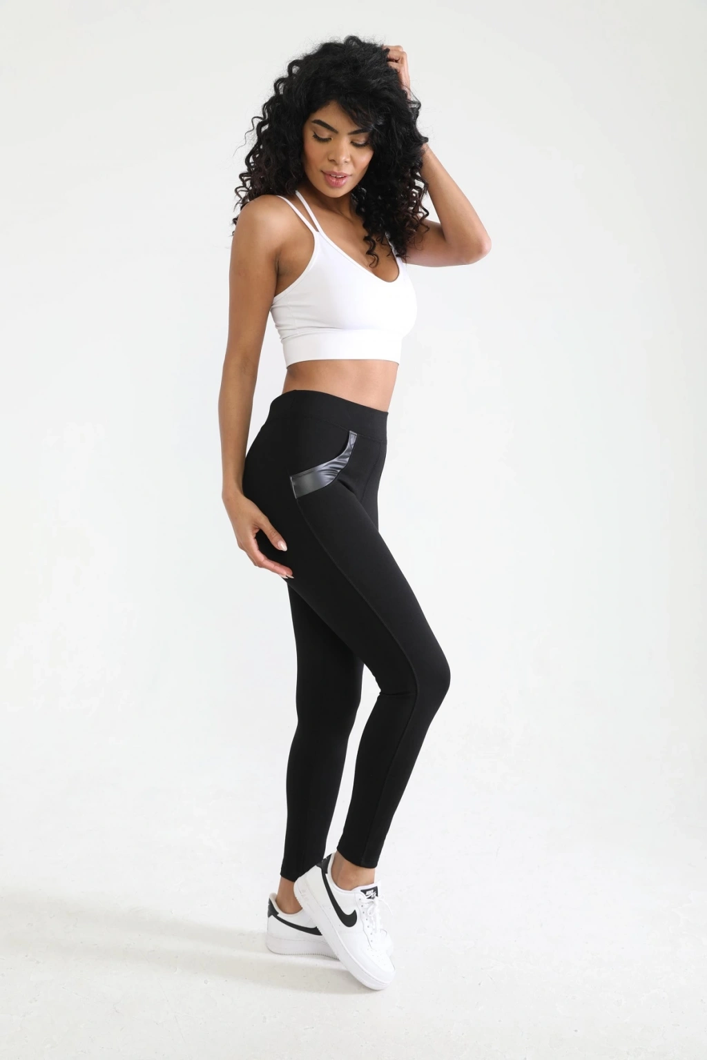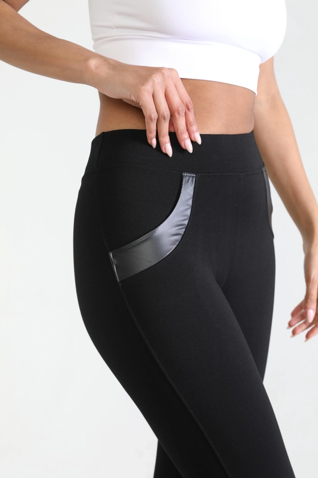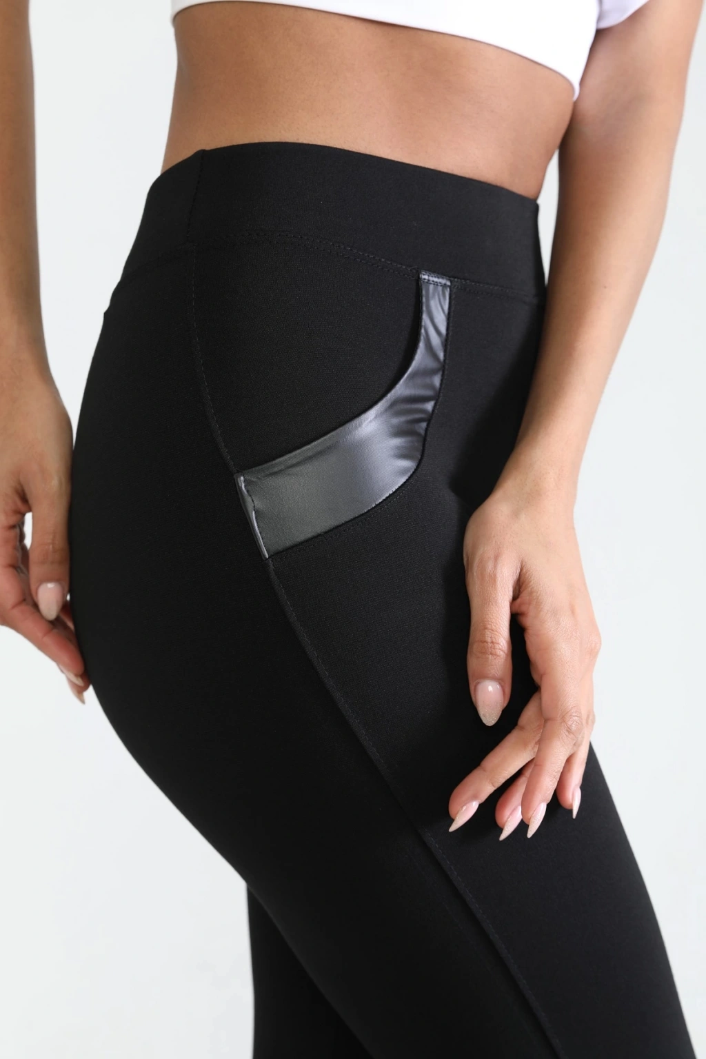 Kadın Siyah Beli Lastikli Yanı Paçası Deri Detaylı Toparlayıcı Tayt